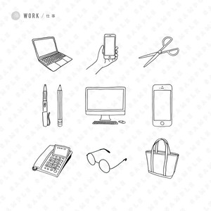 パソコンや電話など「WORK(仕事)」にまつわる線画イラストを10点収録した素材セットです。
