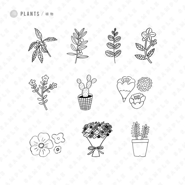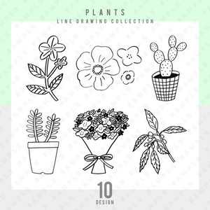 お花や鉢植えなど「PLANTS(植物)」にまつわる線画イラストを10点収録した素材セットです。