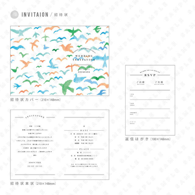 空に羽ばたく色鮮やかな「鳥」をテーマにしたウェディングペーパーアイテムデザイン。青い鳥、ハト、フクロウなど縁起のいい鳥たちがふたりを祝福しています。水彩などアナログで描いたイラストとすぐに使えるペーパーアイテムのテンプレートを収録したウェディング素材集。招待状カバー、招待状本状、返信はがき、席次表カバー、席次表、席札、ロゴや素材などを収録した全21点セット。ペーパーアイテムは、WordとIllustratorのテンプレートデータに新郎新婦やゲストのお名前などを入れるだけで、だれでも簡単に仕上げることができます。手づくりウェディングを楽しみたい方におすすめです。