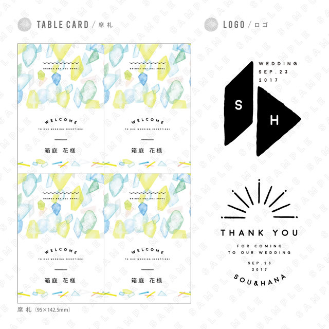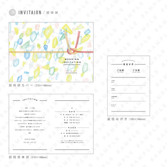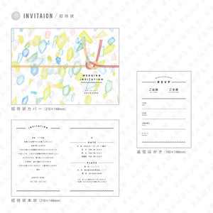 きらきらと輝き続ける「太陽の光」をテーマにしたウェディングペーパーアイテムデザイン。縁起の良い水引のあわじ結びモチーフは、両端を引っ張るとさらに強く結ばれることから、「末永くつき合う」という願いが込められています。水彩などアナログで描いたイラストとすぐに使えるペーパーアイテムのテンプレートを収録したウェディング素材集。招待状カバー、招待状本状、返信はがき、席次表カバー、席次表、席札、ロゴや素材などを収録した全21点セット。ペーパーアイテムは、WordとIllustratorのテンプレートデータに新郎新婦やゲストのお名前などを入れるだけで、だれでも簡単に仕上げることができます。手づくりウェディングを楽しみたい方におすすめです。